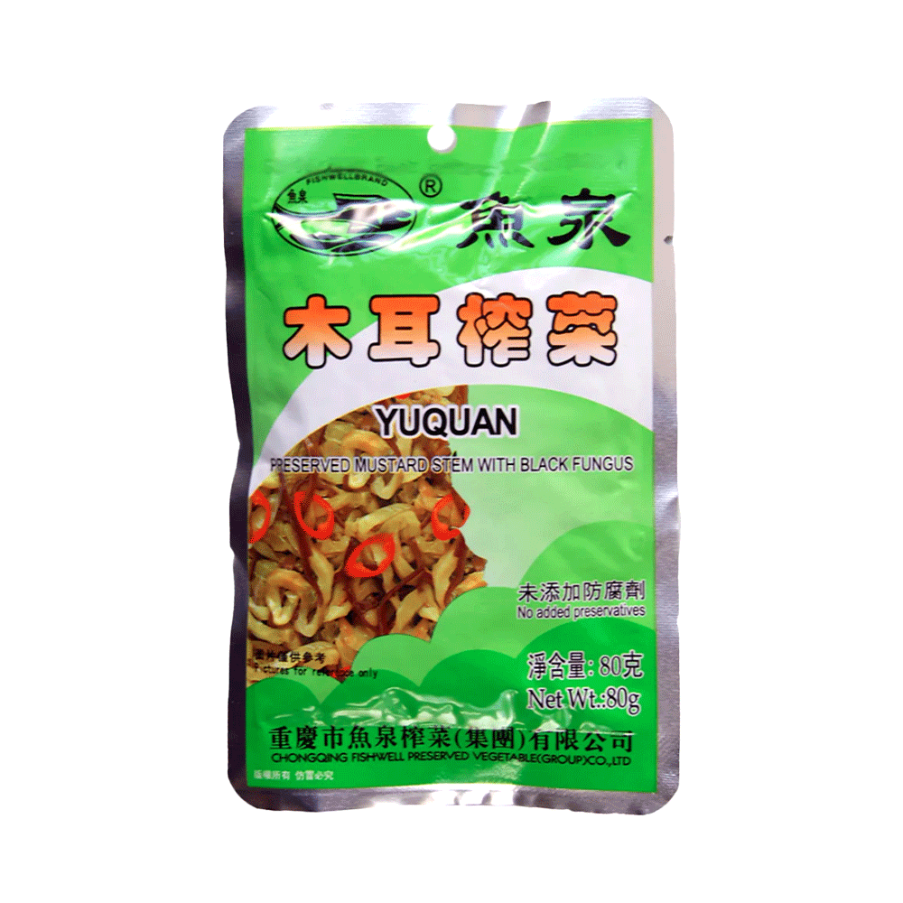 Ingredients List: Preserved Stem Mustard 69.6%, Black Fungus18%, Salt5.6%, Sugar2.5%, Sesame Oil 1.3%, Rapeseed Oil 0.5%, Chilli 0.5%, Food Additives (Monosodium Glutamate 1%, Disodium 5' - Ribonucleotide 0.05%, Citric Acid 0.5%), Spice 0.9%